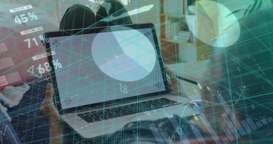 This image depicts a digitally generated scene with graphs and data metrics overlaying a businesswoman using a laptop. The setup communicates themes of modern technology, global finance, and data analytics. Ideal for use in articles or presentations related to business technology, data analysis tutorials, or corporate financial strategy discussions.