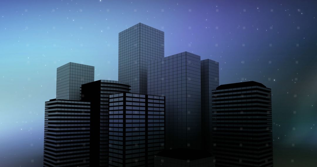 Digitally rendered modern cityscape depicted during night with glowing lights and a serene blue background. This representation of urban skyline offers futuristic elements with reflective architectural surfaces. Ideal for use in technology-themed designs, urban development presentations, or digital art showcases.