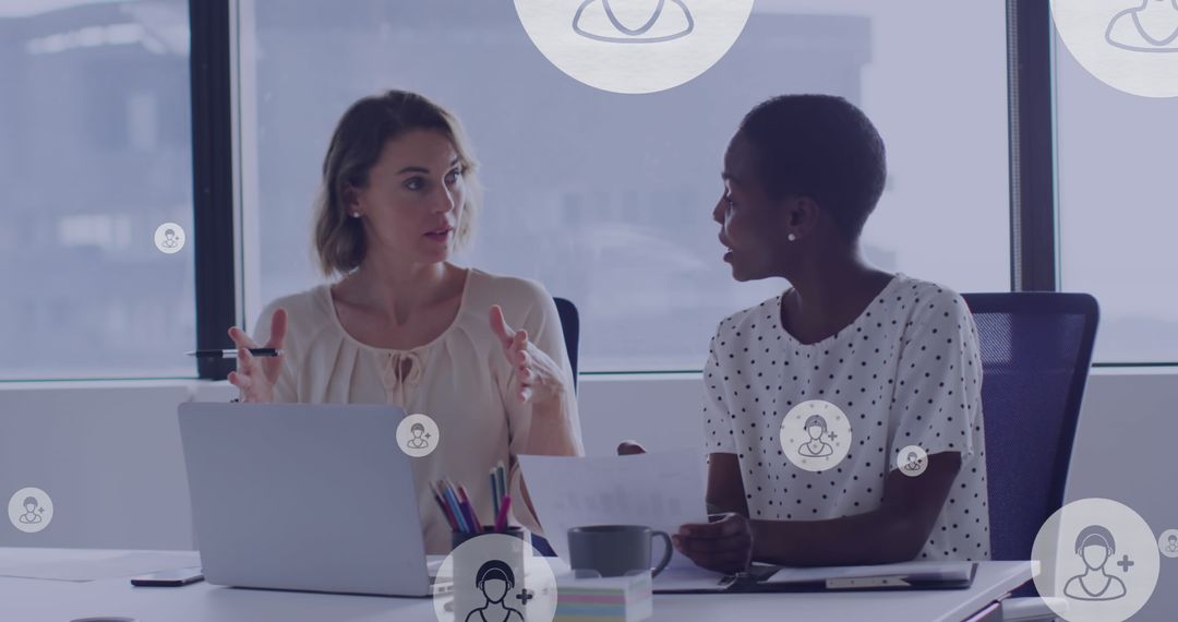 Two diverse female colleagues engaged in conversation at an office desk, with floating digital icons suggesting a high-tech, global communication environment. This can illustrate workplace collaboration, networking, solving business problems, or demonstrating modern technology in action. Useful for projects focusing on diversity, inclusivity, and technology in the professional setting.