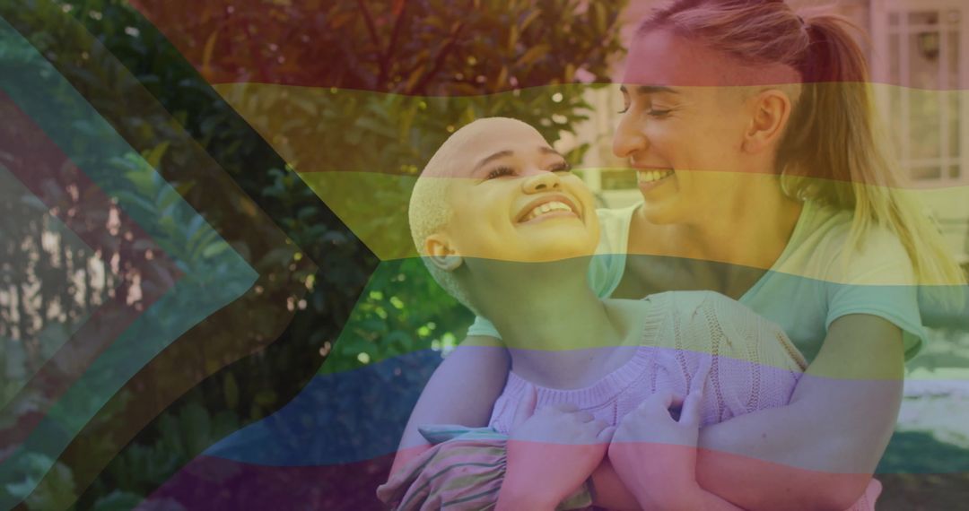 Image depicting a happy, diverse female couple embracing, with a rainbow pride flag overlay representing LGBTQ+ pride and inclusivity. Perfect for promoting pride events, celebrating diversity and acceptance, or enhancing content focused on love and relationships.