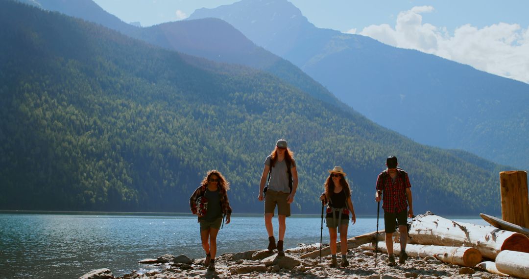 A group of young trekkers leisurely walking along a rocky shoreline with picturesque mountains and a serene lake in background. Perfect for promoting outdoor activities, adventure tourism, travel destinations, and health or fitness endeavors.