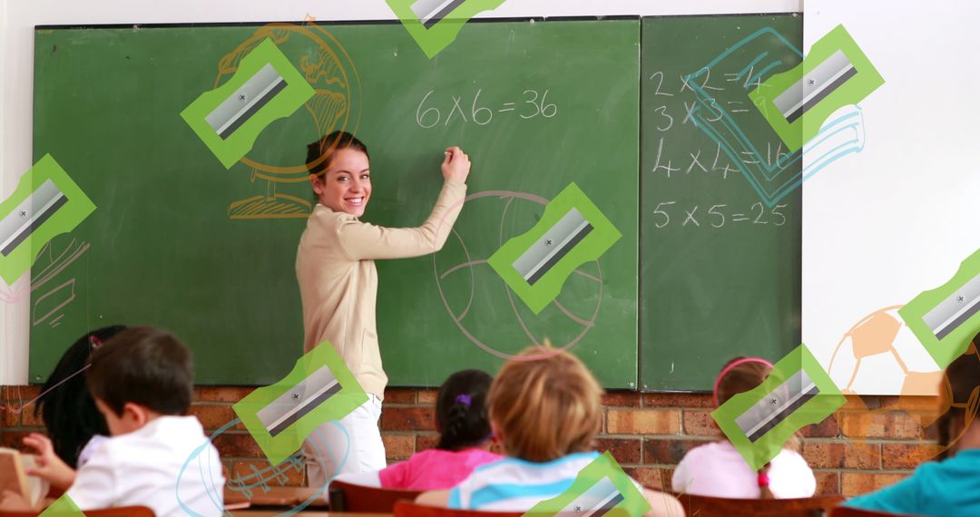 Backdrop shows school supplies overlay adding a fun and engaging visual element. Ideal for promoting educational apps, classroom activities, or creative teaching techniques. Highlights engaging interactive elements and friendly classroom atmosphere.