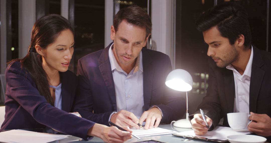Group of professionals from different backgrounds work late at discussing over documents in a corporate environment. Ideal for depicting teamwork, collaboration, business urgency and diversity in the workplace. Useful for articles, presentations, and corporate training materials related to effective teamwork and business success.