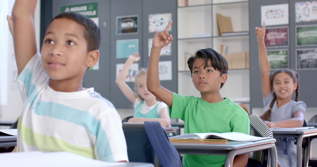 Young children of diverse backgrounds are eagerly raising their hands in a classroom as they participate actively in a lesson. The atmosphere reflects an engaging and inclusive learning environment, emphasizing active learning and curiosity. This image can be used in educational materials, banners illustrating modern, diverse educational settings, and school promotional content focusing on student engagement and diversity.