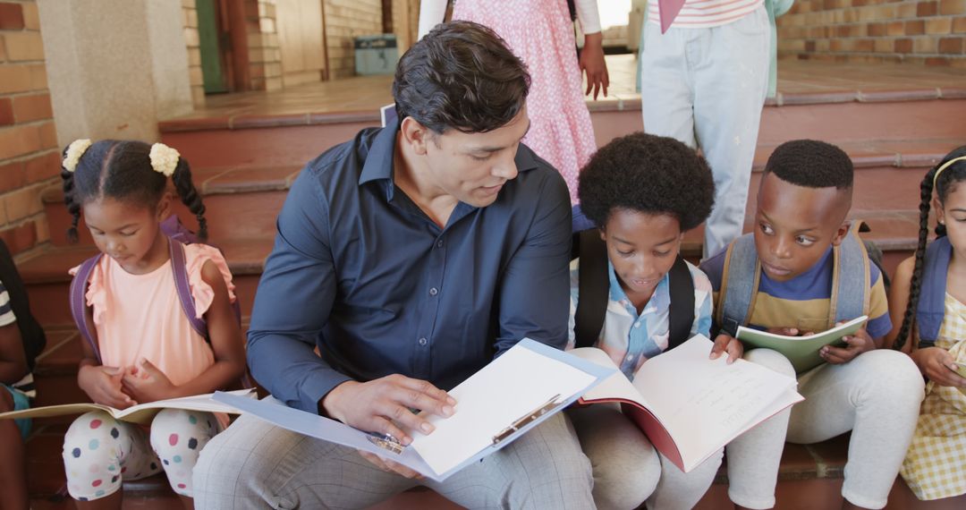 A male teacher collaborates with a diverse group of elementary school students sitting on steps with open notebooks. Ideal for articles or websites focusing on education, diversity in schools, inclusive teaching practices, or classroom activities.