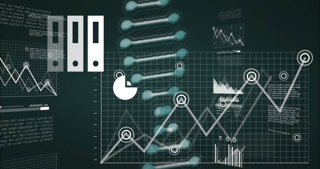 Integrating visuals of a DNA helix with data analytics elements, this image can be useful for promoting technology used in genomics, biology, and scientific research. Attractive for scientific presentations or articles illustrating merging of biology and data technology. Suitable for depicting modern solutions in bioinformatics, addressing analytics in health science strategy.