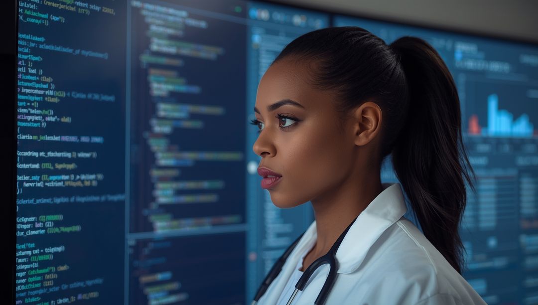 AI Generated Image. Doctor in a modern lab setting carefully studying computer code displayed on multiple monitors. Stethoscope draped around shoulders showcases intersection of medicine and technology. Ideal for illustrating medical innovation, healthcare analytics, or AI's role in modern science.