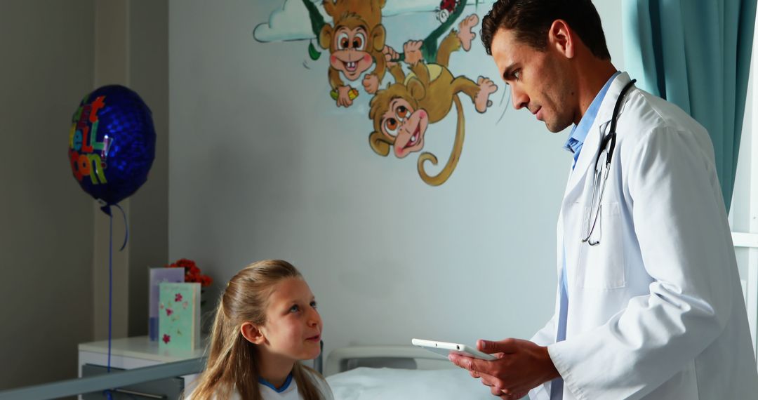 Doctor interacts with girl in hospital, creating a comforting environment for healthcare providers and children-focused health campaigns. Suitable for illustrating professional medical care in pediatric settings and emphasizing the importance of caregiver communication.