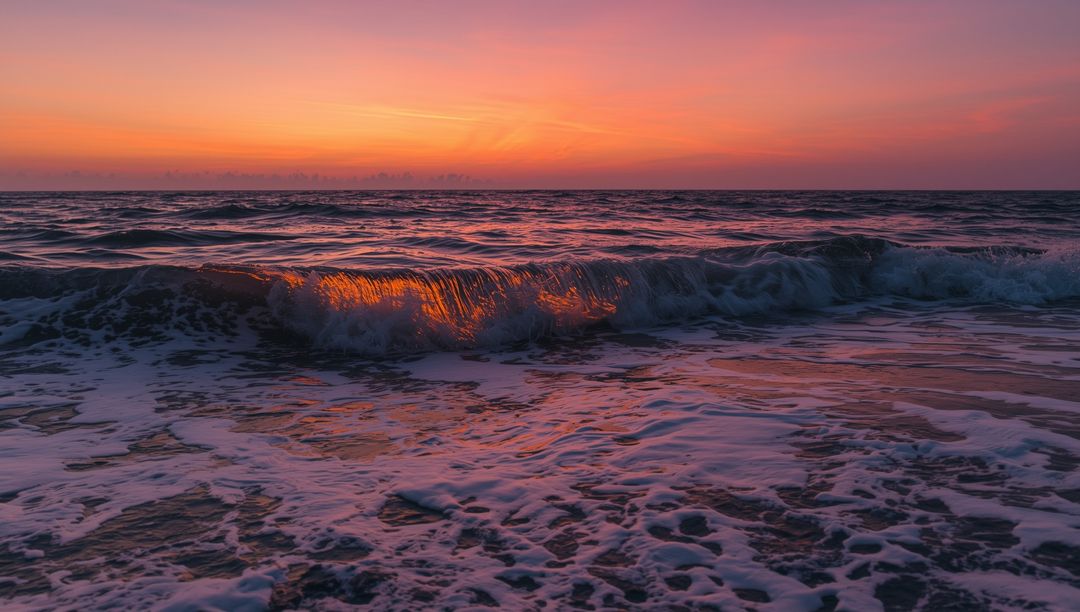 AI Generated Image. This captivating image showcases a beautiful seascape where a rolling wave is catching the warm hues of a sunset. Sea foam swirls on the ocean's surface, contrasting with the vibrant sky. It evokes a sense of tranquility and connection with nature, making it ideal for use in travel brochures, relaxation themed websites, environmental campaigns, and coastal decor purposes.