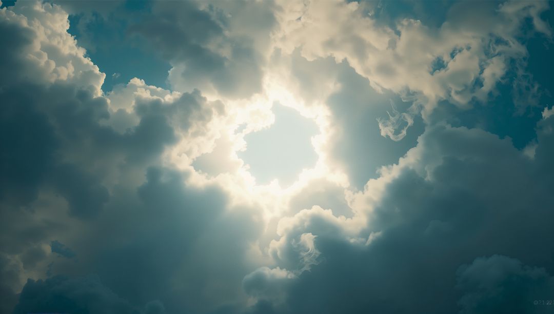 AI Generated Image. Cloudscape highlighting an opening in the dark cumulus with sun rays illuminating swirling clouds, offering a visually striking representation of changing weather. Ideal for use in backgrounds for websites, inspirational quo visuals, or nature-themed projects emphasizing awe-inspiring natural phenomena.