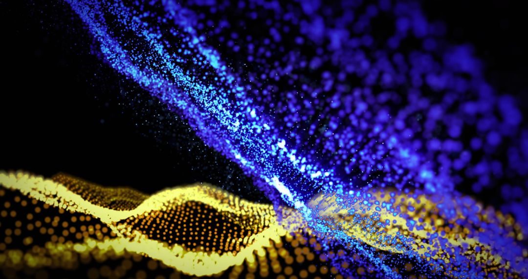 Abstract digital illustration showcasing vibrant blue particles flowing over a dynamic yellow 3D landscape against a black background. Ideal for use in technology-related content, presentations, websites, and educational materials focusing on digital innovation, communication technologies, or abstract art concepts.