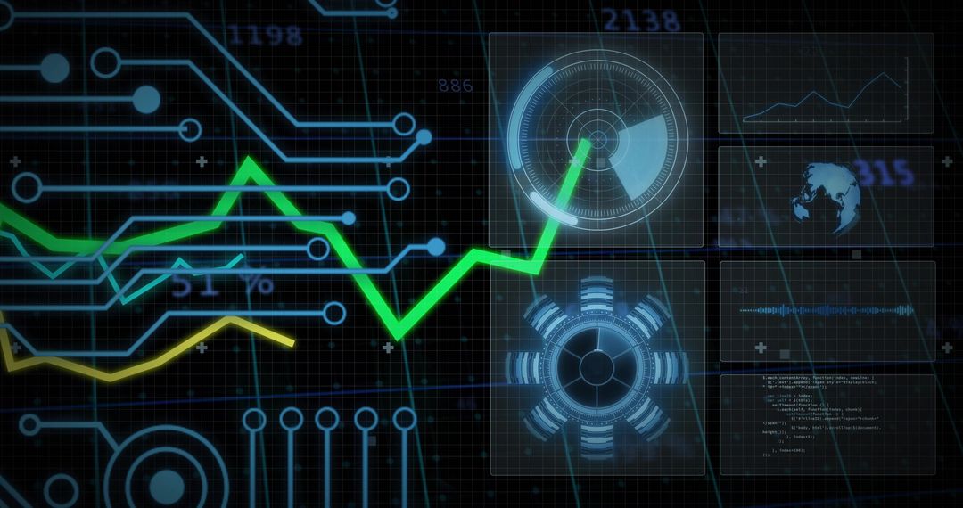 Depicts advanced digital interface featuring rising green line graph crossing a yellow line over a blue circuit grid. Panels displaying radar and data analytics are included, suggesting concepts of technology, cybersecurity, and innovation. Useful for illustrating modern technological themes, data analysis projects, or futuristic designs in digital contexts.