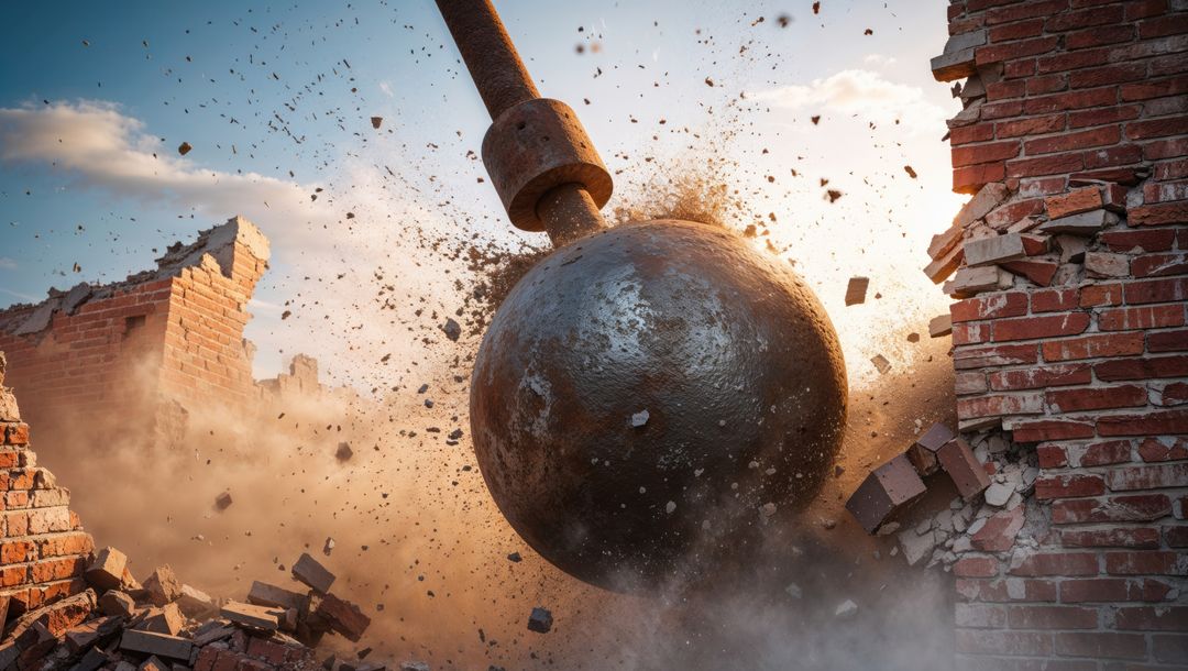 Dynamic Wrecking Ball Demolishing Brick Wall with Flying Debris Image