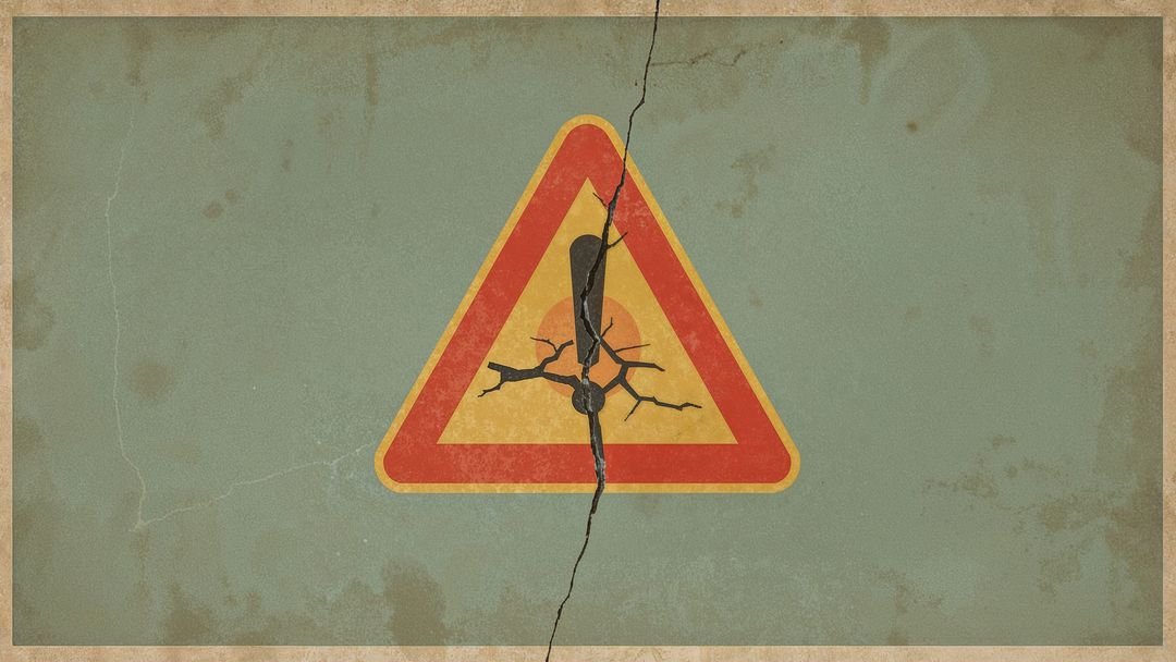 AI Generated Image. Visual shows a red-yellow hazard sign featuring a black exclamation mark. Prominent earthquake cracks and fissures appear on a teal-colored panel. Art evokes themes of warning, risk, or deterioration and can symbolize vulnerability or potential danger. Useful in contexts involving safety, construction, engineering, or risk assessment.