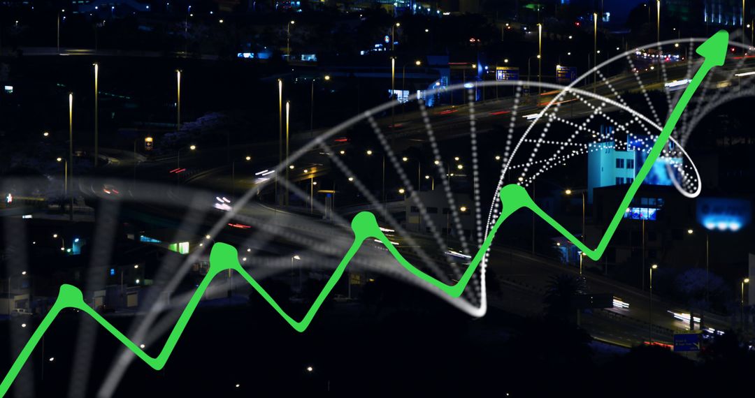 Visualizing the intersection of economics and technology, this image combines a glowing financial graph with a fading DNA strand against a vibrant nighttime city backdrop. Perfect for illustrating concepts of modern business growth, biotechnology innovation, urban development, and digital progress. Use in presentations where future cityscapes and global economic trends are discussed.