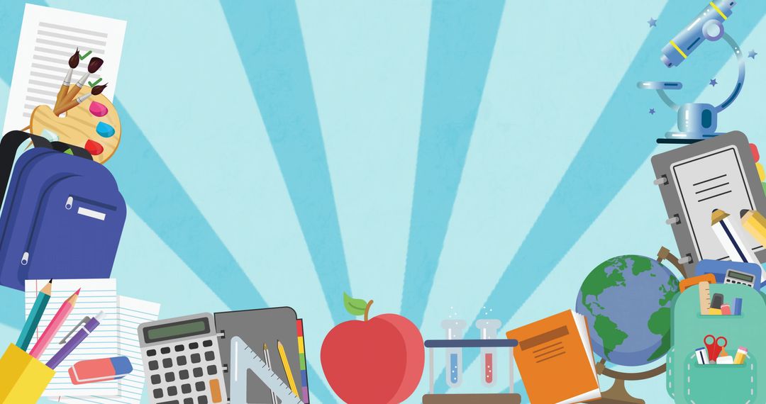 Colorful illustration depicts variety of school supplies like apple, backpack, calculator, books, globe, microscope. Shows back to school, educational themes. Useful for educational posters, school newsletters, teachers aids, kids activity books.