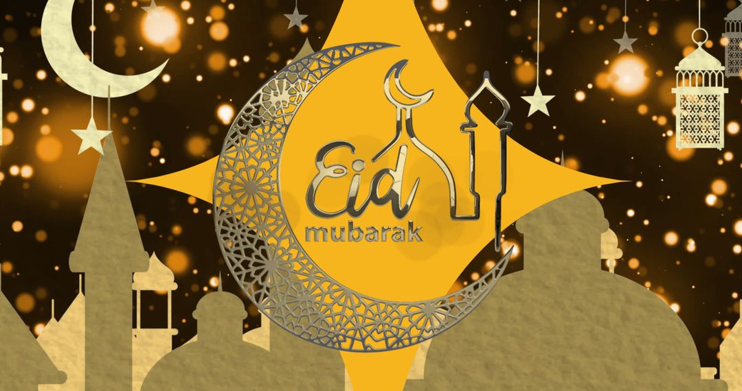 Design features the text 'Eid Mubarak' prominently placed alongside a mosque silhouette and a crescent moon against a glowing golden background with sparkling lights and ornaments. This can be used for sending festive greetings, social media posts, and designing banners or invitations related to the celebration of Eid al-Fitr or Eid al-Adha.