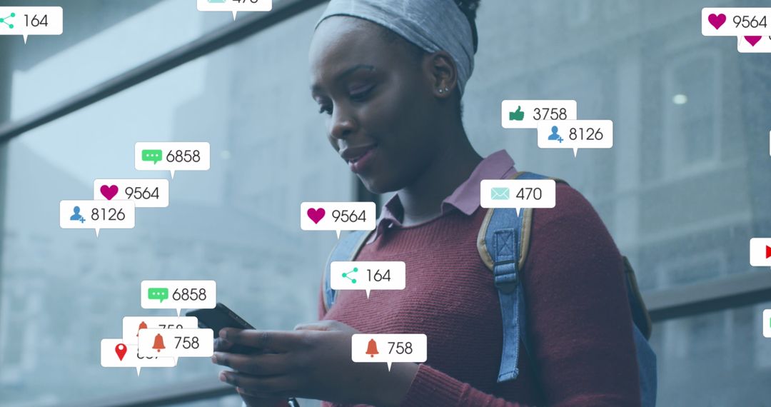 Young African American woman using smartphone while surrounded by virtual social media notification icons. Represents engagement with digital communication platforms. Suitable for topics on technology addiction, online connectivity, social behavior, and digital marketing. Ideal for illustrating blog posts on social media strategies or campaigns highlighting interactive online experiences.