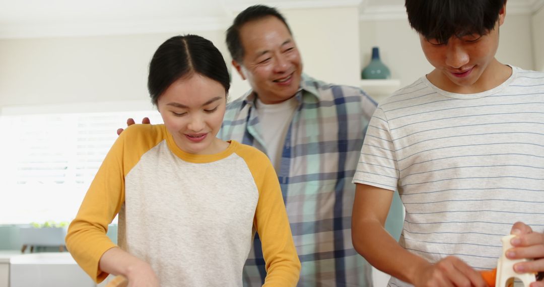 Family spending quality time together in kitchen, infused with warmth and joy. Ideal for promoting family values, cooking brands, kitchenware products, or lifestyle blogs emphasizing bonding and home life aspects.