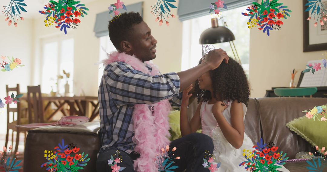 Joyful scene with father and daughter engaging in imaginative play, perfect for topics on family bonding, joyous childhood experiences, and parental love. Use in blogs, promotional materials for family-oriented products, or inspirational articles emphasizing quality family time. Eye-catching floral border adds whimsical and themed appeal suitable for festive advertisements or greeting card designs.