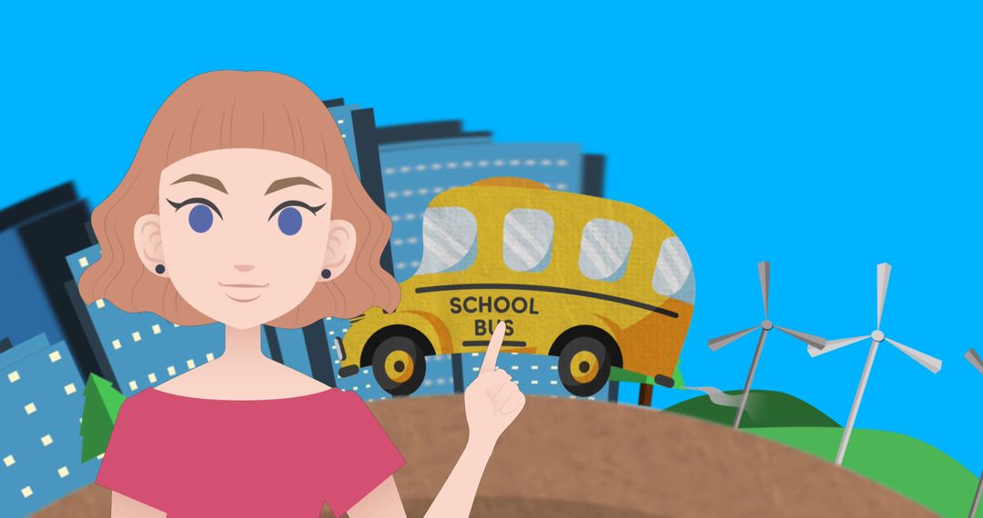 Illustration features a woman smiling and pointing at a cartoon school bus symbol with a modern city and wind turbines. Ideal for promoting mentorship in educational settings, sustainability initiatives, and celebrating National Mentoring Month.