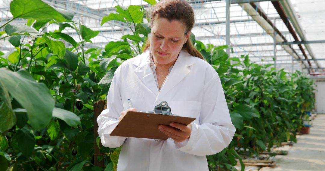 A middle-aged Caucasian woman is engaging in a detailed plant analysis inside a greenhouse. Dressed professionally in a lab coat, she documents her observations, indicating a research or scientific study in agricultural sciences. The scene evokes themes of modern agriculture, research in plant sciences, and environmentally controlled botanical work. This visual can be recommended for promoting agricultural technologies, scientific research publications, educational materials, and sustainable farming practices.