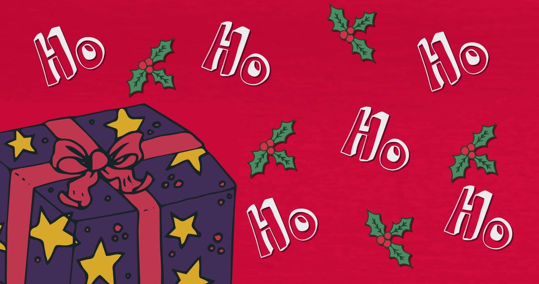 Festive design showcases a cartoonish gift box with star patterns wrapped in a bow next to 'Ho Ho Ho' text and scattered holly leaves on a vibrant red background. Perfect for Christmas themes, holiday cards, festive digital graphics, or seasonal marketing materials emphasizing joy and celebration.