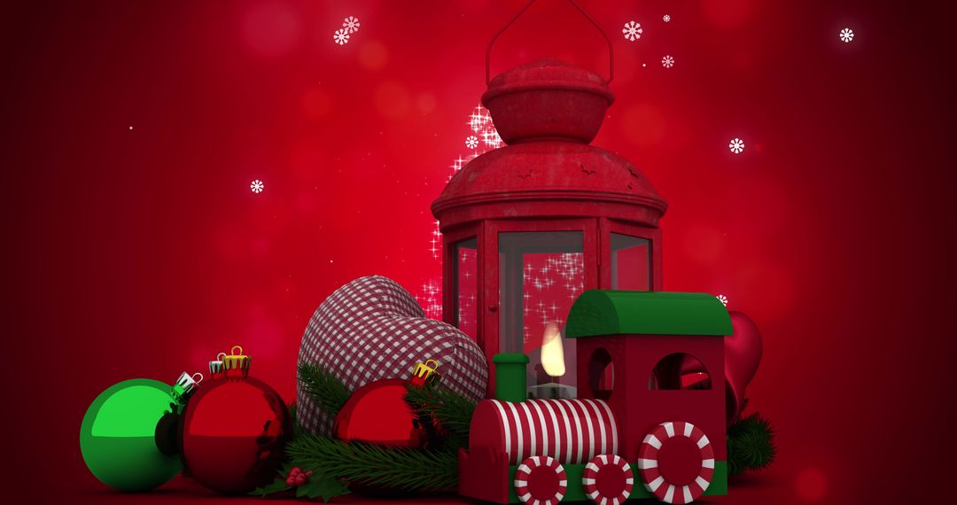Christmas lantern and ornaments placed on a glittering red backdrop evoke festive season vibes. Glowing candle inside matches red baubles and small green train for a cheerful holiday theme. Suitable for Christmas cards, invitations, décor inspiration and festive promotions.