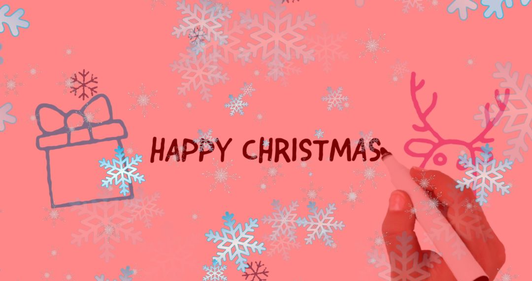 Pink backdrop with handwritten 'Happy Christmas' surrounded by doodles of reindeer, gift box, and snowflakes. This cheerful seasonal design serves well as a greeting card cover or crafting inspiration for holiday decorations and themed social media posts.