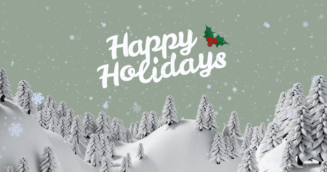Charming winter scene with snow gently falling over a serene landscape illustrated in a digital style. The phrase 'Happy Holidays' adds a festive element. Perfect for holiday greeting cards, digital marketing campaigns, festive invitations or seasonal newsletters conveying the essence of winter holidays.