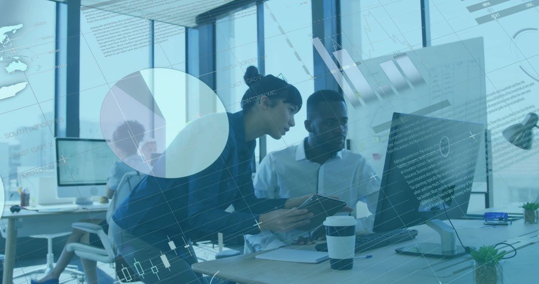 Team of professionals collaboratively examining financial data on computer, showcasing diversity and teamwork in a contemporary office with digital data overlay. Ideal for articles or presentations on modern business practices, diversity in workplace, financial planning and data analysis.