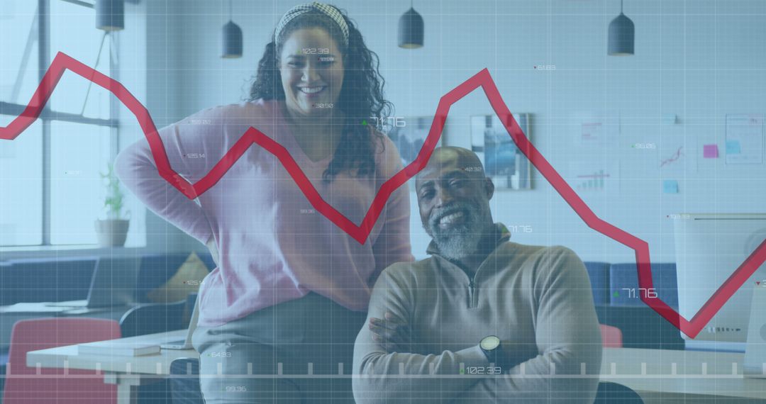 Image depicting diverse business professionals working in a modern office environment, engaged in financial analysis with a graph overlay. This is ideal for illustrating teamwork and data-driven decision-making in corporate contexts. Useful for articles on financial strategies, diversity in the workplace, and data analysis. The red line chart signifies market trends or business performance.