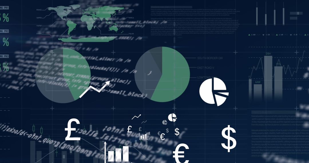 Dynamic image illustrating financial data analysis using advanced digital interface icons. Background features financial graphs, currency symbols, and world maps representing the global market. Ideal for business applications focused on analytics, financial technology, and digital economy trends. Perfect for articles on finance, stock market analysis, or corporate presentations.