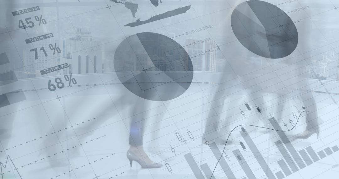 Financial charts and graphs overlap business professionals walking, symbolizing dynamic business environment and modern financial technology. Ideal for illustrating global finance concepts, economic reports, or teamwork in a high-tech office setting.