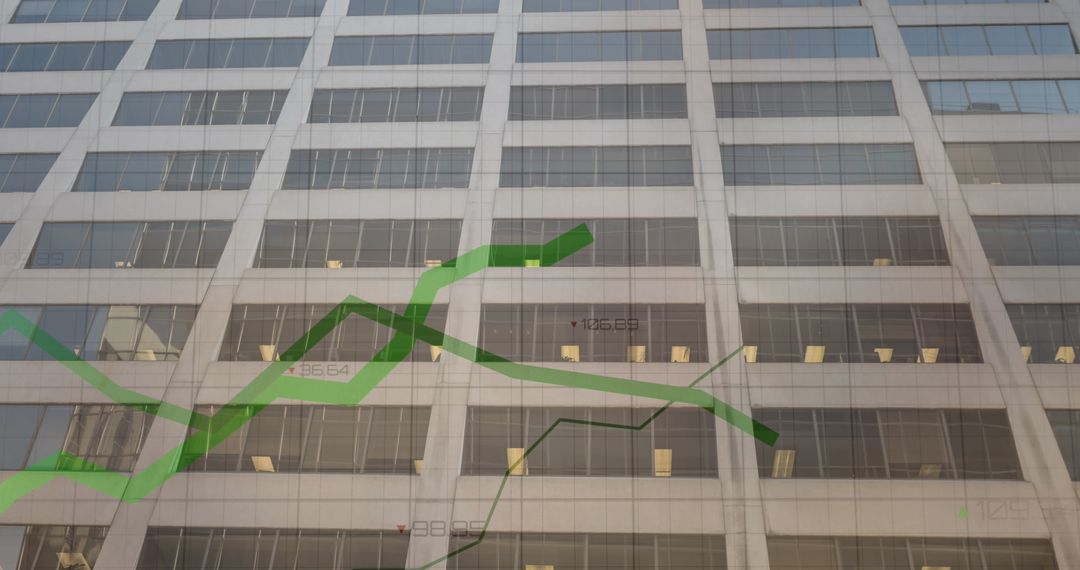 Financial Graph Overlay on Urban Glass Building Facade Image