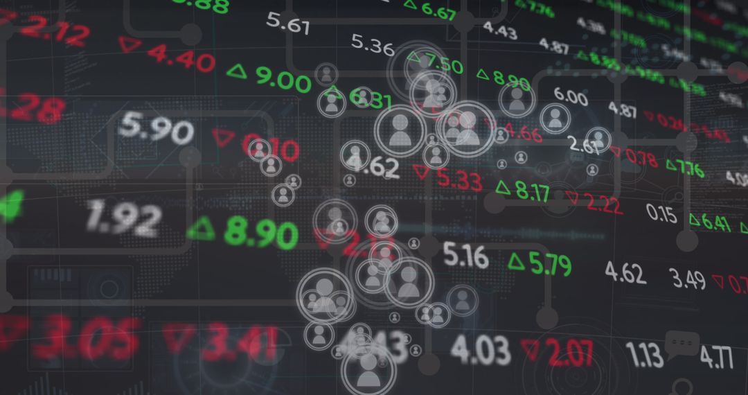 Abstract representation of financial networking on a digital dashboard displaying market tickers and user participation symbols. Red and green numbers indicate market fluctuations, embodying the volatile financial environment visualized through modern technology. Can be used for articles on financial market analysis, economic trends, digital finance technology, and cybersecurity.