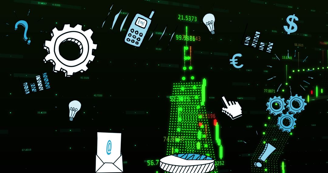 A vibrant collage of financial technology icons against a black, digital background with illuminated data elements. This image illustrates the interconnectedness of today's global economy, featuring symbols such as gears, currency signs, question marks, light bulbs, and charts representing networking and tech innovation. It evokes themes of digital communication, network security, and technology industry dynamics. Ideal for use in financial reports, tech blog posts, educational content, or cyber security campaigns.