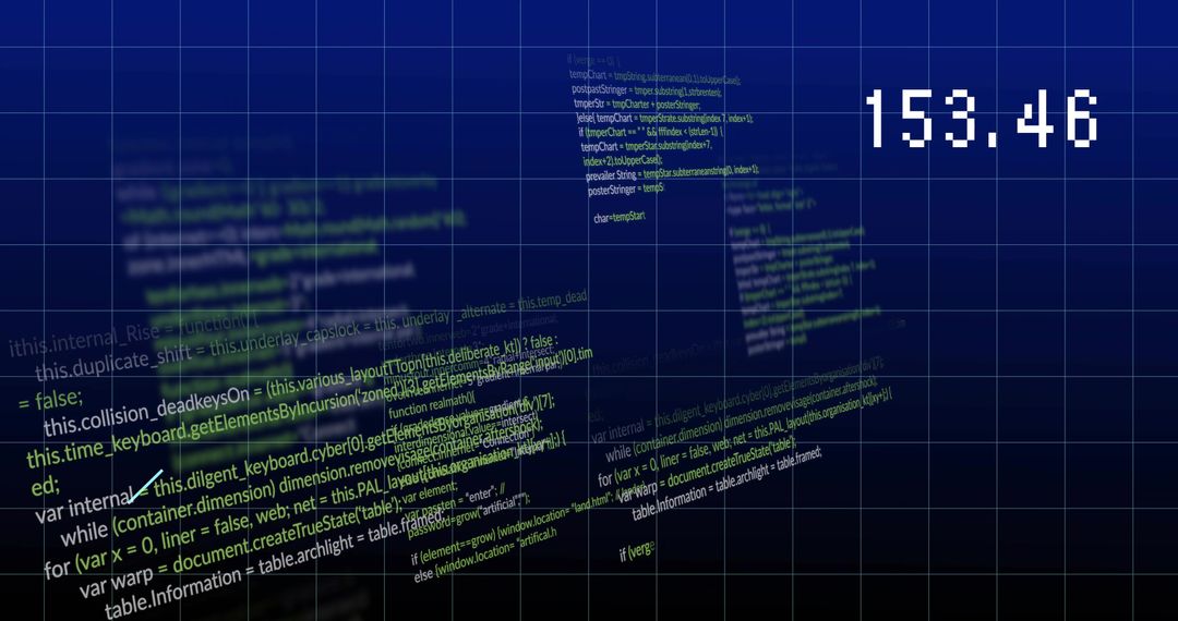 - Floating code panels displaying numeric readout 153.46 on neon grid dashboard interface