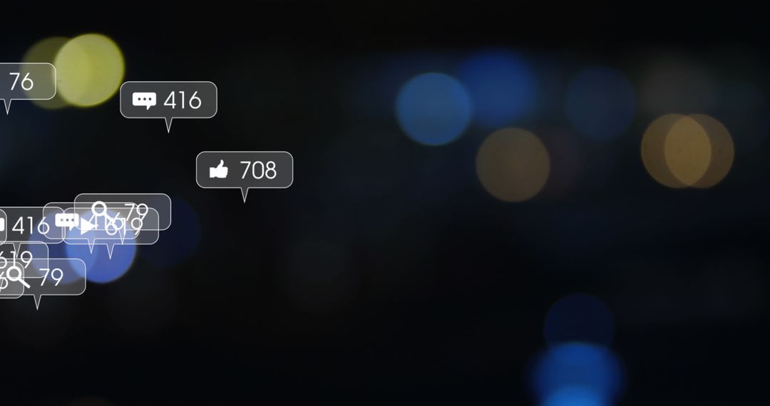 Bokeh style floating notifications with social media icons on dark background suggest digital communication and online interaction. Suitable for illustrating social media engagement, digital marketing strategies, and virtual communication concepts in presentations, articles, and digital ads.