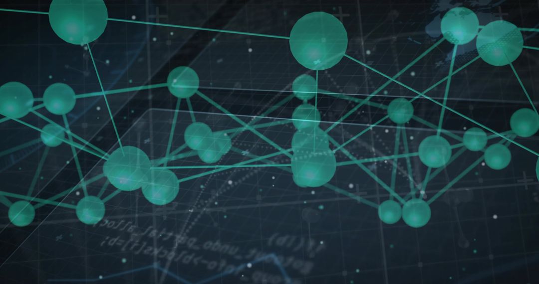 Presenting interconnected teal spheres linked by glowing lines over dark grid plane, conveying complex network structures, depth, and motion. Featuring translucent spheres of varying sizes, diagonal connecting lines, subtle data points and faint code overlays, evoking cybernetic and scientific atmosphere. Pairing teal neon palette with deep slate background for strong contrast and modern aesthetic. Suiting technology and data science projects such as website hero banners, presentation slides, fintech and blockchain marketing, AI research reports, cybersecurity briefs, startup pitch decks, editorial illustrations, and social media campaigns. Working well as header graphic for SaaS dashboards, UI mockups, conference materials, infographics, and book covers related to networks, machine learning, or digital transformation.