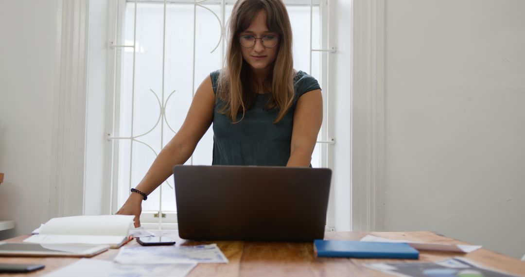 - Focused Businesswoman Working on Laptop in Office Environment