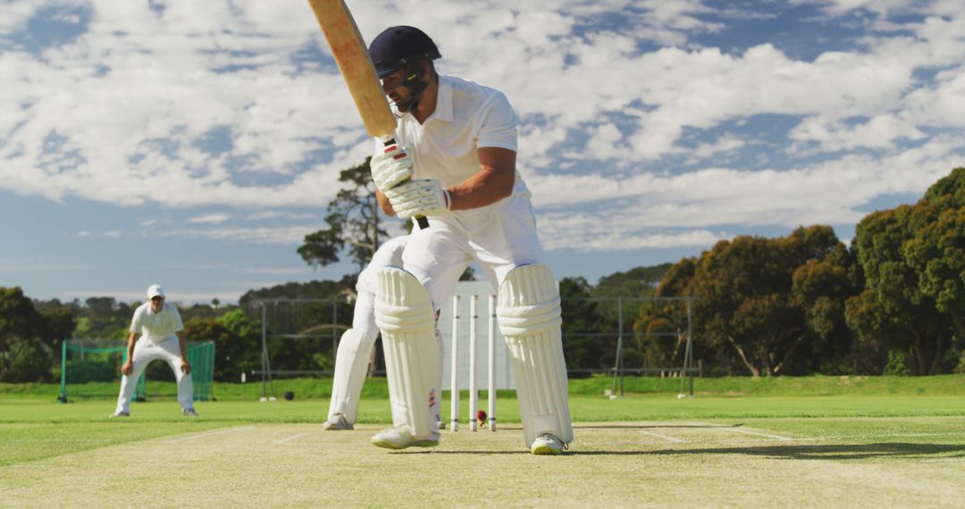 - Focused Cricket Batsman Ready to Hit on Sunlit Field