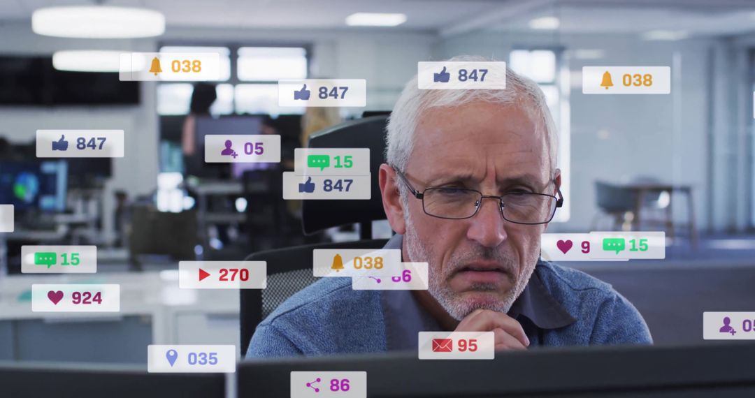 - Focused Elderly Man Surrounded by Digital Social Media Notifications
