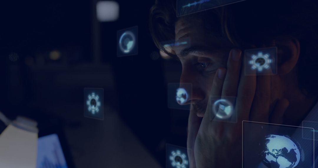 Male professional in office sitting at desk with an intense focus on computer screen as digital icons and user interface graphics float around, indicating advanced technology integration. This depicts concepts of data analysis, concentration, and technological innovation. Useful for illustrating late-night work, tech-driven jobs, or articles on emerging digital solutions and data analytics software.