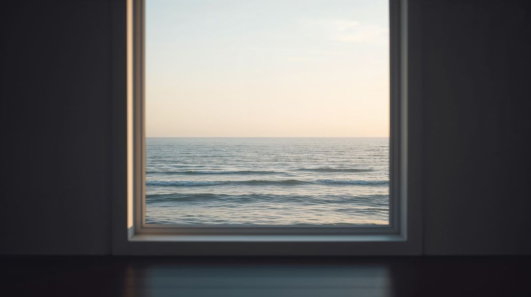 - Framing Large Window Revealing Calm Sea Horizon, Minimalist Interior with Warm Light