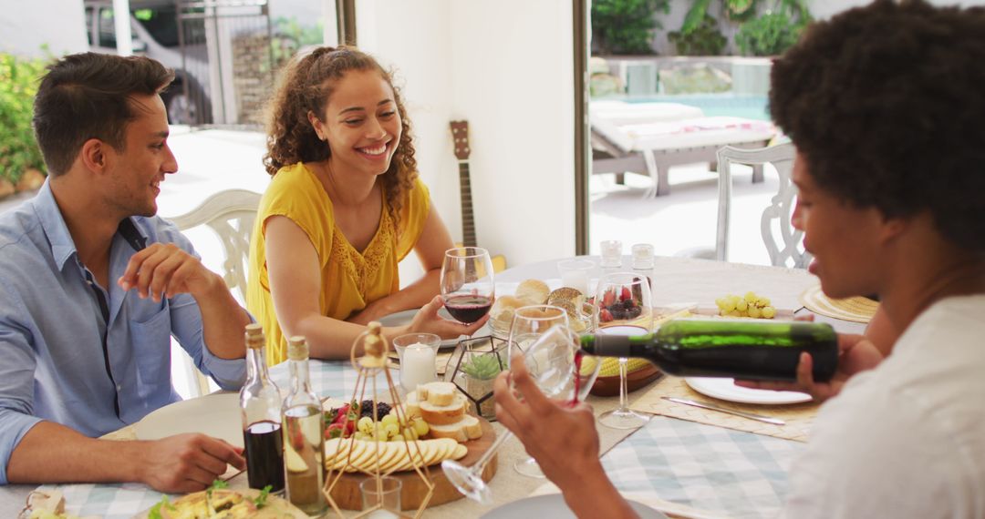 Group of friends gathered around table on patio, sharing joyful moments while enjoying wine and snacks. The relaxed atmosphere is ideal for use in campaigns about socializing, outdoor entertaining, culinary experiences, or lifestyle promotions encouraging leisure time with friends.