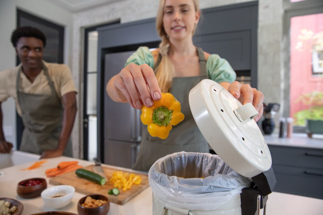 Friends engaged in eco-conscious culinary activity in a modern kitchen. Focus is on placing a yellow pepper into countertop bin for composting while preparing fresh vegetables like carrots and zucchini. Scene exemplifies teamwork, sustainable living, and vibrant lifestyle choices. Useful for themes related to sustainability, healthy living, and cooking tutorials.
