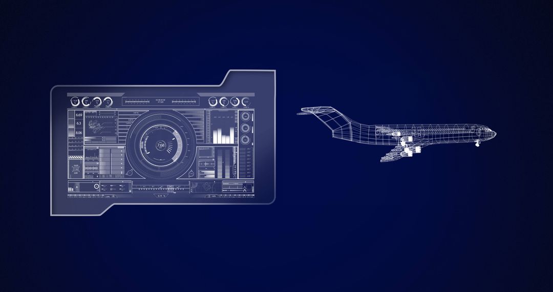 Digital illustration showing a detailed wireframe model of an airplane alongside a technologically advanced data interface dashboard, hinting at future innovations in the aviation industry. Ideal for technological ad campaigns, aviation reports, and presentations on digital advancements and industry insights.