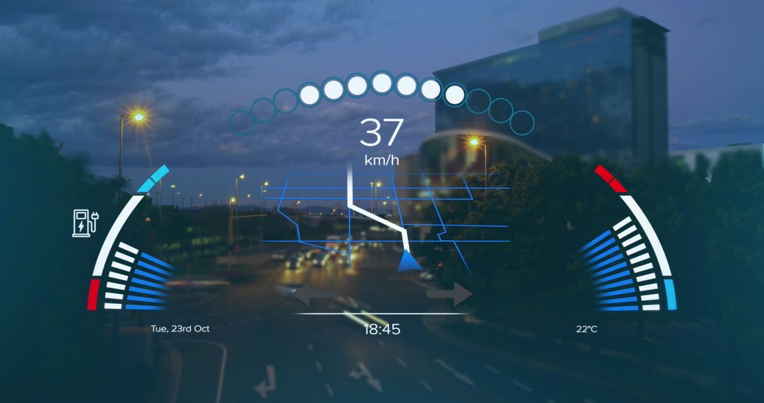 Futuristic digital car interface displayed over lively city streets at night exemplifies modern transportation concepts. Highlighting speed, street map, fuel level, and other metrics, it resonates with themes of innovation and technology in urban settings. Ideal for presentations on smart cities, augmented reality tech, and future vehicle design concepts.