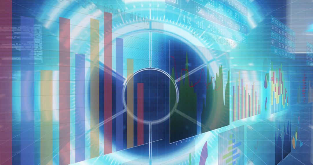 This imagery presents a futuristic virtual reality interface combining bar charts, line graphs, and data panels, conveying an immersive narrative ideal for depicting digital innovation and data-driven futurism. Useful for articles or presentations about financial technology, data analytics advancements, or digital trends.
